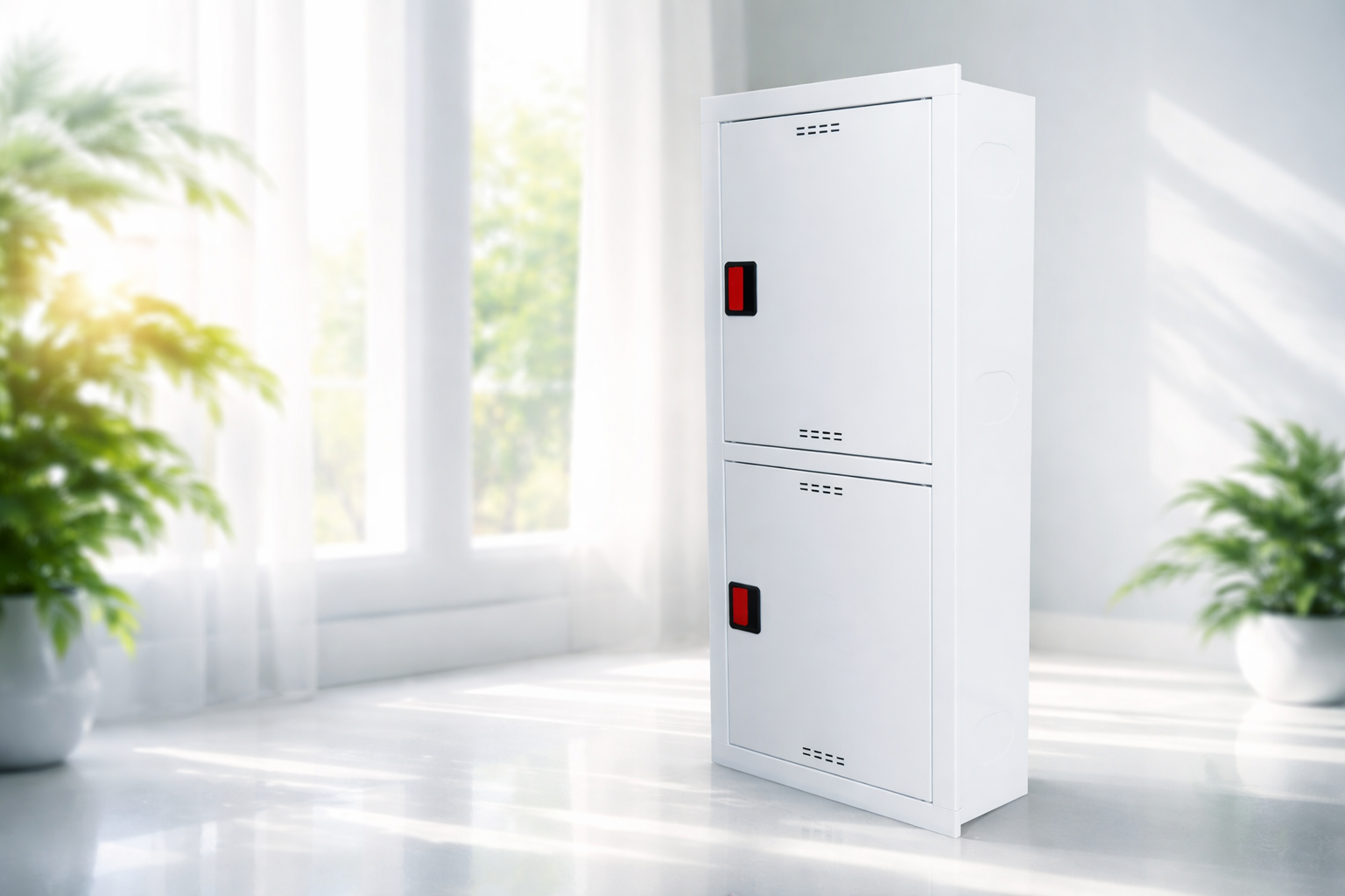 ШП-К 320-21 — это двухсекционный пожарный шкаф, оснащенный отдельными отсеками для каждого вентиля и рукава. Каждая секция включает поворотную кассету (турель), которая позволяет быстро разматывать рукав без лишних усилий. Такой дизайн идеален для объектов с повышенными требованиями к пожаротушению: многоквартирных домов, офисных центров, производственных помещений и общественных зданий.